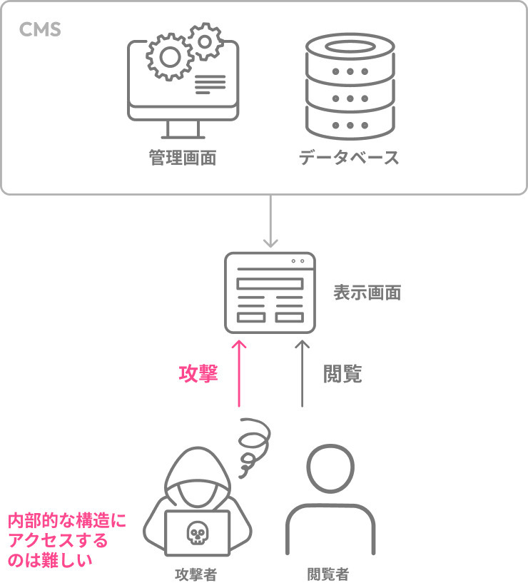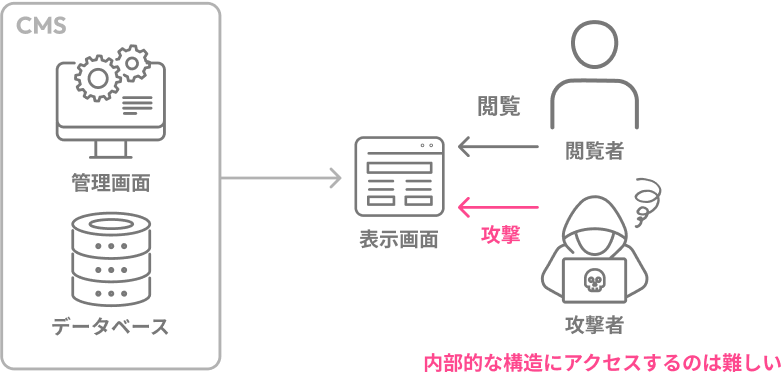 CMSサーバーとフロント環境が独立しているため、サイバー攻撃があってもデータベース側は影響を受けにくい