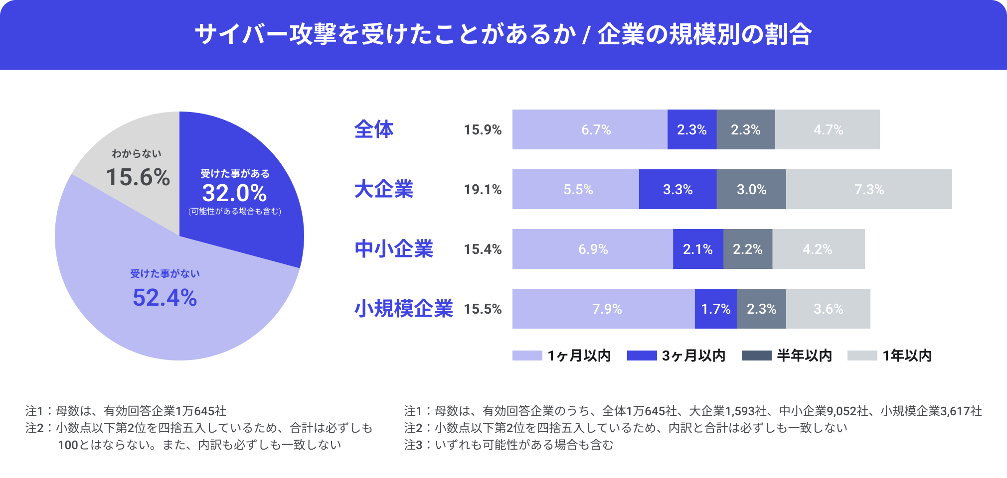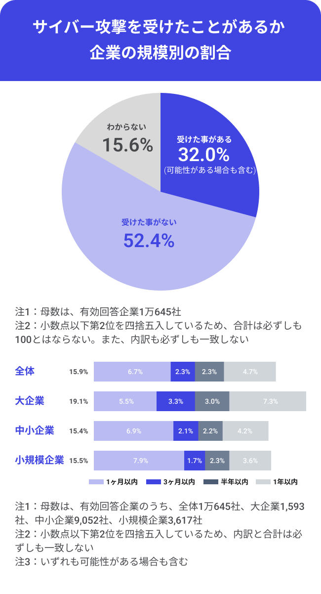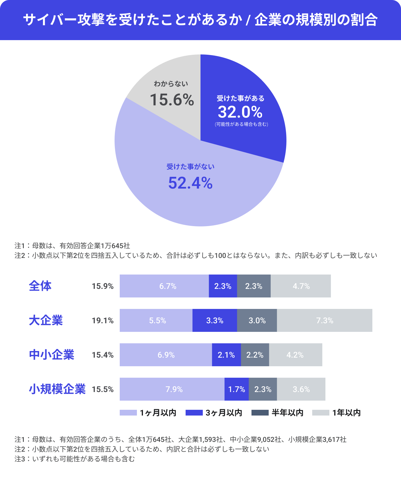 規模別の割合としては大企業が多いという結果でしたが、1ヶ月以内にサイバー攻撃を受けた(可能性がある場合も含む)企業の割合は中小企業/小規模企業の方が高く、「大企業よりも対策が比較的手薄な中小企業の被害増加が顕著になっている」として早急な対策整備が必要といえます。